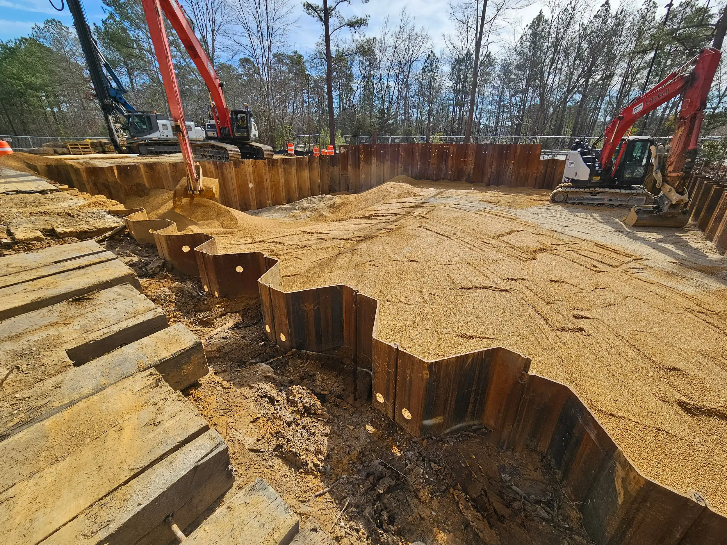 LRI ultimately utilized a watertight steel sheet pile cell with internal bracing for removal of RCRA Hazardous soils to an average depth of 26’ below grade. During removal and management of soils, groundwater was pumped and treated through an on-site water treatment system to maintain dry conditions during excavation and backfilling. All treated groundwater was tested and discharged in compliance with a Virginia Pollutant Discharge Elimination System Permit.